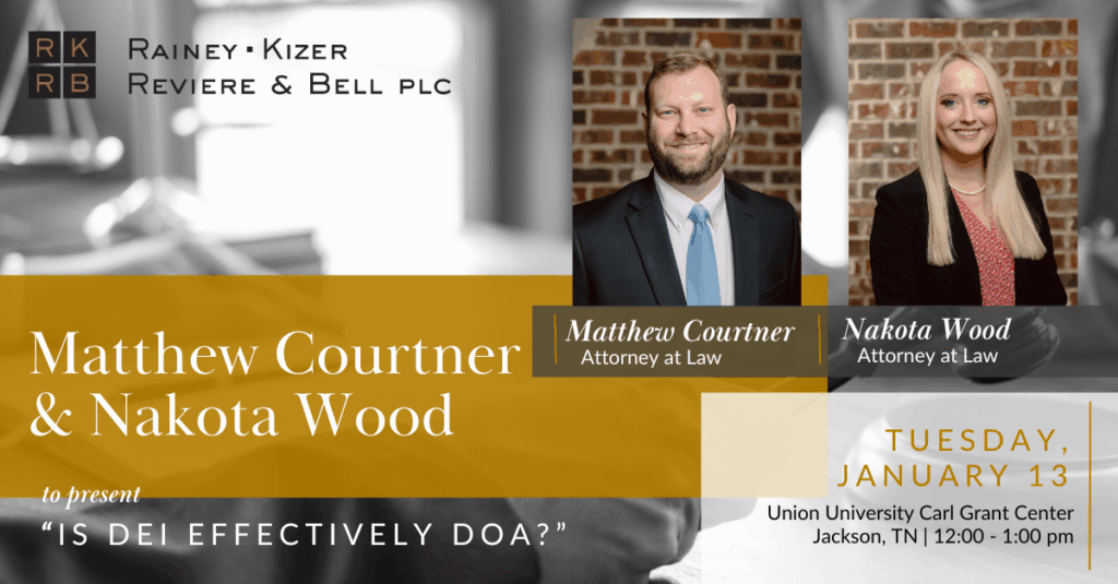 Matthew Courtner and Nakota Wood will present “Is DEI Effectively DOA?” to HR professionals at the West Tennessee SHRM Chapter meeting on Tuesday, January 13. This presentation will examine the current state of Diversity, Equity, and Inclusion (“DEI”) initiatives in light of recent federal policy developments. It will provide a clear and practical overview of relevant executive orders and Department of Justice guidance that have reshaped the legal and regulatory framework governing workplace DEI programs. Attendees will gain insight into how these federal actions affect employer compliance obligations, risk-management strategies, and the future of DEI efforts in the workplace.