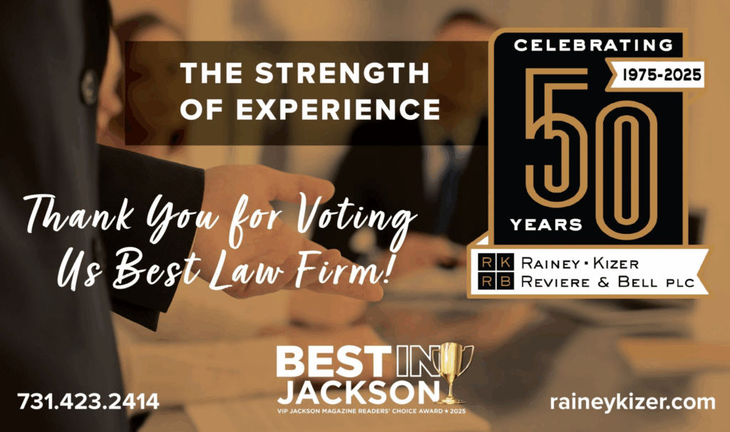 Rainey, Kizer, Reviere & Bell, PLC is honored to be voted Best Law Firm by Best in Jackson VIP Jackson Magazine Readers' Choice Award for 2025. From its founding, the Firm has had an unwavering commitment to provide effective and efficient legal services to its clients, whether in litigation, advising businesses, real estate or property law, or any of the many other areas of practice. The Firm recognizes that is takes more than lawyers for a law firm to succeed and grow for 50 years. It takes a dedicated administrative team, a business office staff, and legal assistants, paralegals, receptionists, and clerks. While continuing to grow, the Firm has maintained its focus on the core values that guide the Firm: (1) Excellence, (2) Integrity, (3) Professionalism, and (4) Respect. Thank you for voting us Best Law Firm! We look forward to serving the Jackson community and surrounding areas over the next 50+ years!